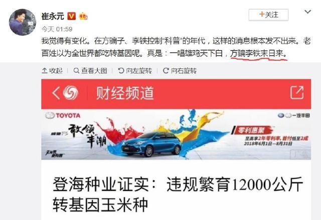 可是转基果的食物事实平安仍是不平安呢?那个小编也不克不及妄下定论,只能告诉大师仍是要以相信科学为从。崔永元微博再发声“他俩的末日要来了”,网朋们的立场一边倒。对此你怎样看呢?欢送鄙人方评论区留言,谈谈你的见地。